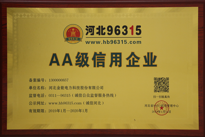 熱烈祝賀金能電力獲河北省96315“信用等級證”