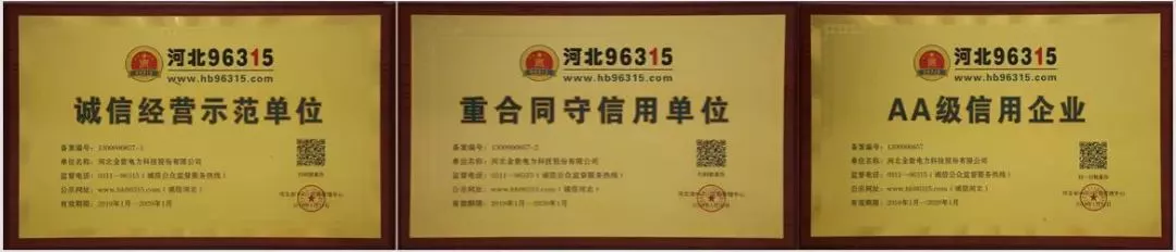 金能電力榮獲河北96315“誠信經(jīng)營示范單位”、“重合同守信用單位”、“AA級信用企業(yè)”