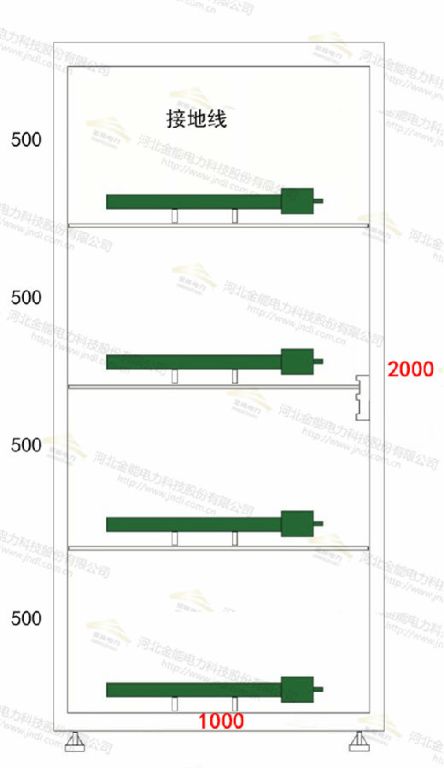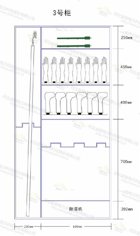 如上圖規格為2000*800mm,左側高2000mm,寬200mm存放接地線,右半部分寬600mm,分為4層,其中頂部250mm存放驗電器,下面450mm存放絕緣手套,下面400mm存放絕緣靴,下面700mm可存放令克棒等安全工器具,底部200mm為除濕機。